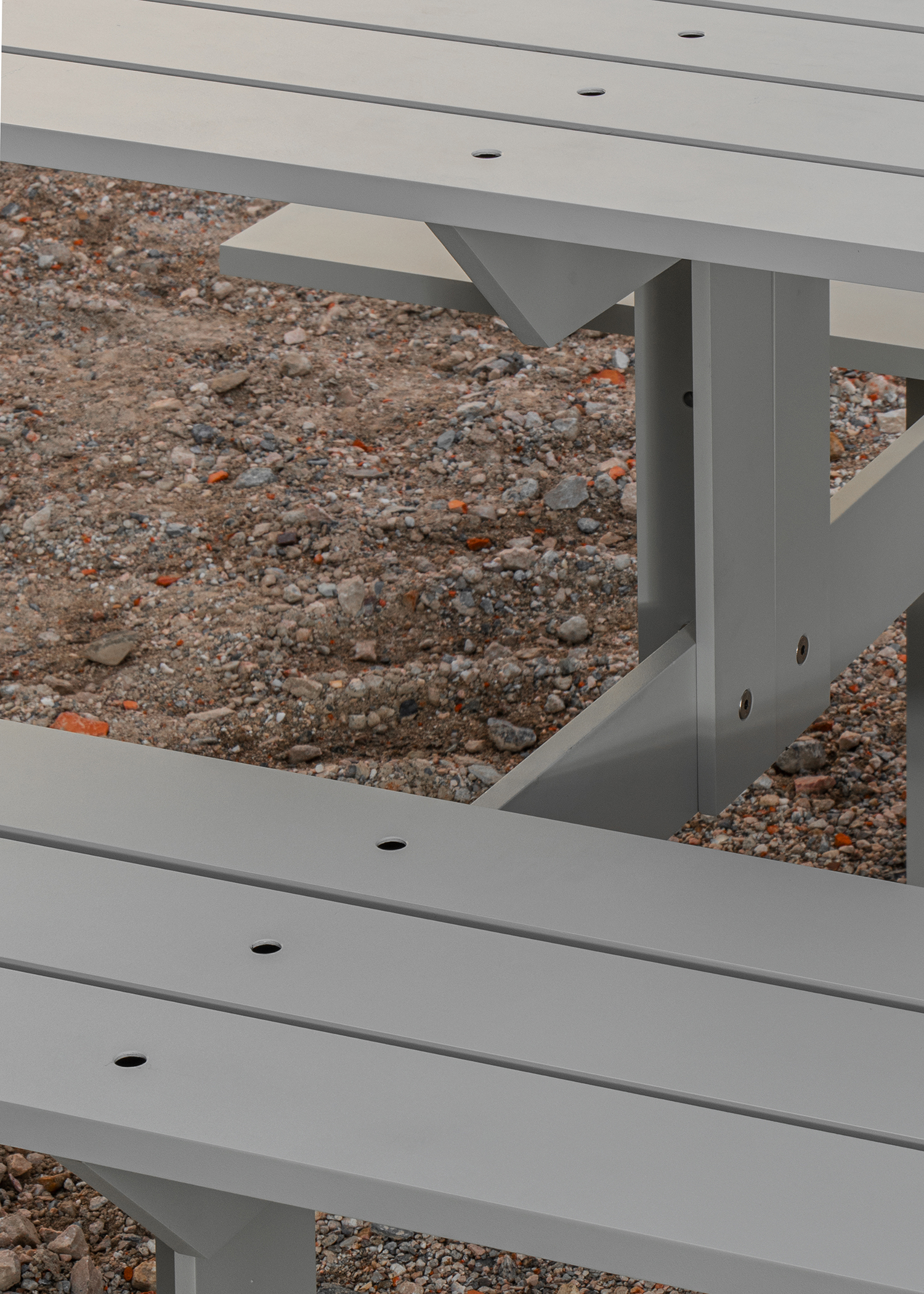 A new take on the standard picnic table, made with several 120x20mm aluminium profiles. The table is finished with a sandblasted texture and powder coated, making it adapted for both indoor and outdoor use.