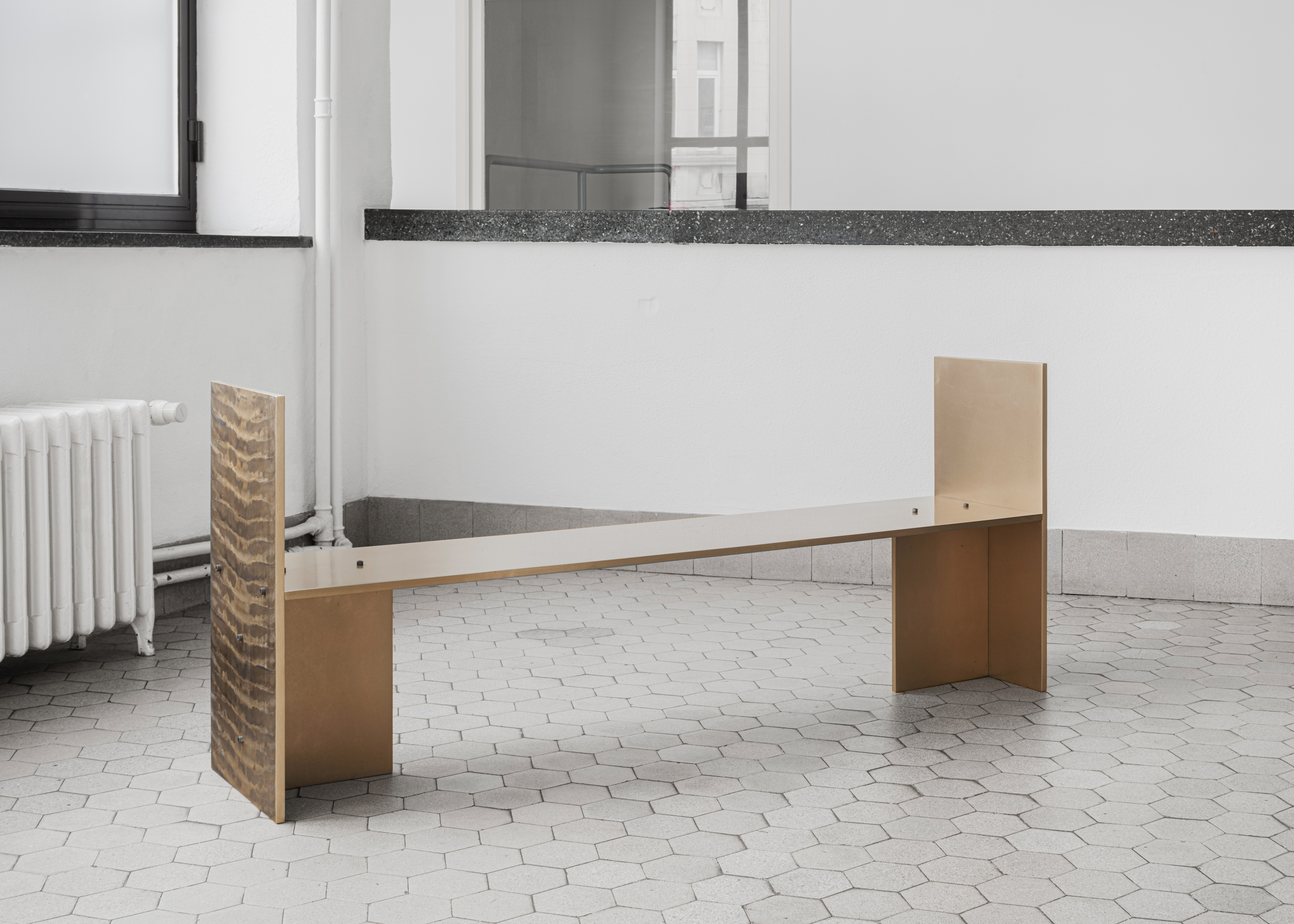 Made from one entire bronze profile, the bench displays a subtle surface treatment highlighting its true colour. The smooth - and soft - ness of the inside contrasts with the roughness of the outside, left raw from casting.